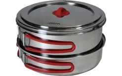 Schönes und stabiles Familienkochset mit 3 Töpfen, Pfanne und Deckel. Silikonbeschichtete Klappgriffe für gutes Handling und platzsparenden Transport. Jeder Topf hat eingeprägte Füllmengenanzeigen. Der Deckel ist mit einer siebartigen Abseihöffnung versehen. Komplett mit Netzbeutel für den sicheren Transport.