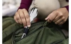 Dieses robuste und mit 42g dennoch ultra-leichte Besteck-Set erfüllt diese Anforderungen. Hergestellt aus Titan lässt es sich praktischerweise übereinander stapeln und wird für den Transport mit einer hitzebeständigen Silikon-Manschette zusammengehalten.