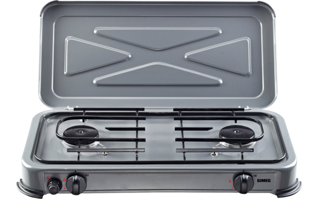 Der Kocher ist mit einem stabilen Pfannenhalter ausgestattet, der Platz für zwei Pfannen bietet. Der Deckel kann auch als Windschutz genutzt werden und auch vom Herd getrennt werden. Mit einer Schraube oder einem Schlauchanschluss kann der Kocher mit einer Propan- oder Butangasflaschen verbunden werden.