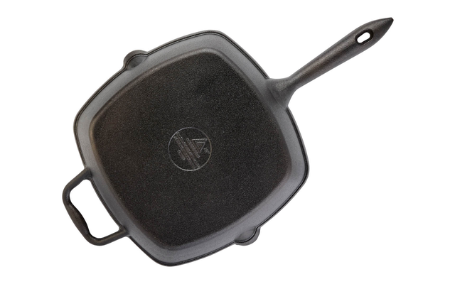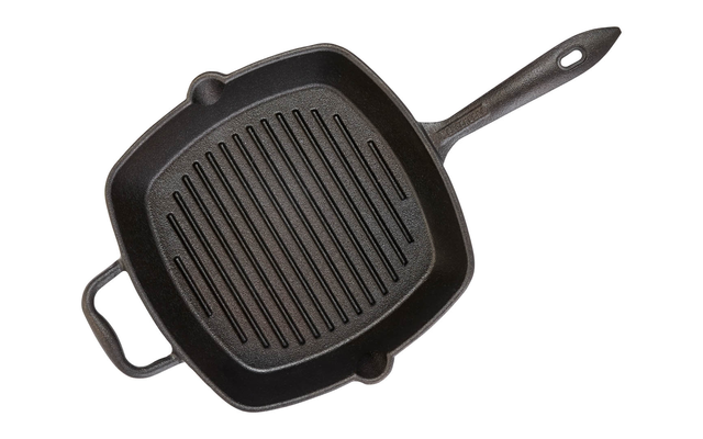 Gusseiserne Pfanne zum geschmacksintensiven und natürlichen Braten und Grillen – auch direkt über dem Feuer. Das erhöhte Rippenprofil sorgt beim Braten und Grillen für herrliche Röstaromen bei reduziertem Fettanteil. Kurzgebratenes wird außen knusprig und bleibt innen saftig, aber auch längeres Braten auf hoher Hitze ist problemlos möglich. Das ausgetretene Fett kann ganz einfach über die Ausgüsse an beiden Seiten abgegossen werden.