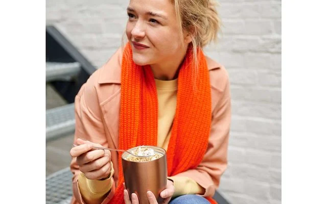 Rennt Dir morgens auch immer die Zeit weg? Da bist Du nicht alleine! Nimm Dir für unterwegs in diesem Thermo-Lunchpot in Nordic denim frischen Joghurt und ein knuspriges Müsli mit (das im Deckel auch schön knusprig bleibt). Der doppelwandige Edelstahlbehälter hält Deinen Joghurt kühl, sogar bis zur Mittagspause.