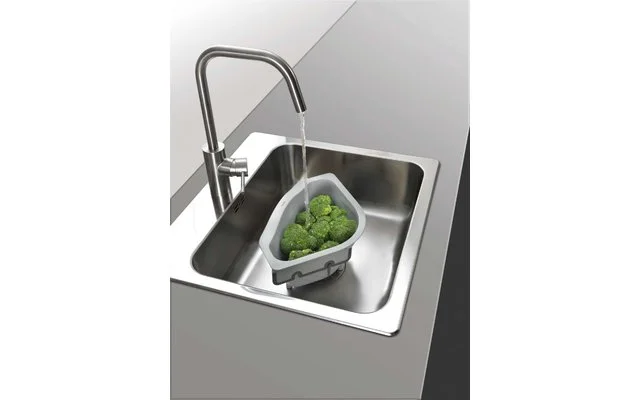 Drain-On Ecksieb aus Kunststoff, mit variablen Anti-Slip Klappen zur Befestigung am SpĂĽlbeckenrand.Â