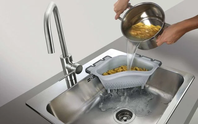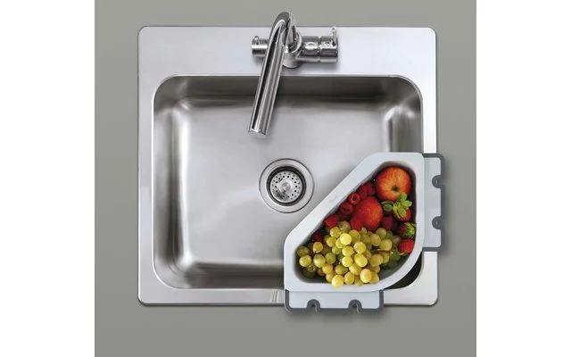 Drain-On Ecksieb aus Kunststoff, mit variablen Anti-Slip Klappen zur Befestigung am SpĂĽlbeckenrand.Â
