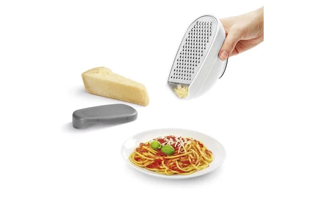 Trio-Box Reibe mit Behälter und Deckel. Mit 3 verschiedenen, wechselbaren Reiben. Behälter mit Antislip-Boden und Deckel. Auch für die Aufbewahrung von Lebensmitteln geeignet.