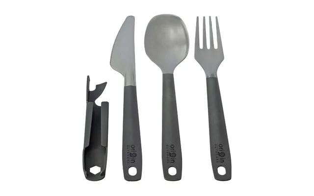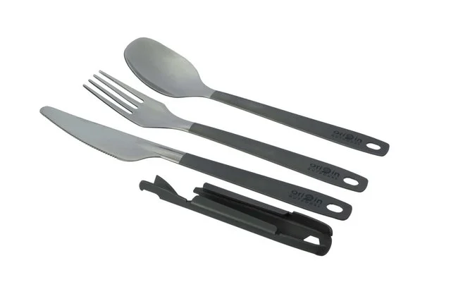 Messer, Gabel und Löffel sind aufwändig poliert. Zusätzlich befinden sich in der Halterung ein Dosen- und Flaschenöffner sowie ein 6-Kant-Ringschlüssel Größe 7.
