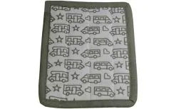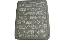 Pufz Topflappen mit zwei verschiedenen Mustern (Wohnwagen/Wohnmobil), einmal weiĂź auf grau und einmal grau auf weiĂź.