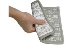 Pufz Topflappen mit zwei verschiedenen Mustern (Wohnwagen/Wohnmobil), einmal weiĂź auf grau und einmal grau auf weiĂź.