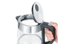 Dieser kompakte Glas-Wasserkocher integriert sich stilvoll und modern in Ihre Küche. Mit 1 l Kapazität ist er extrem platzsparend und verhindert unnötiges Verschwenden von Wasser im Alltag. Durch die 1-Hand-Bedienung lässt er sich komfortabel bedienen – dank beidseitig bedruckter Wasserstandsanzeige ist er zudem perfekt für Rechts- und Linkshänder geeignet. Die hochwertige Kombination aus Glas und Edelstahl ist nicht nur optisch ein echter Hingucker, sondern garantiert auch einen unbedenklichen Genuss.