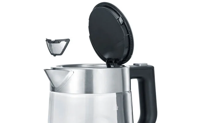 Einfache Reinigung dank klappbarem Deckel. Herausnehmbarer und abwaschbarer Kalkfilter. Ausgusszotte für punktgenaues Ausgießen.