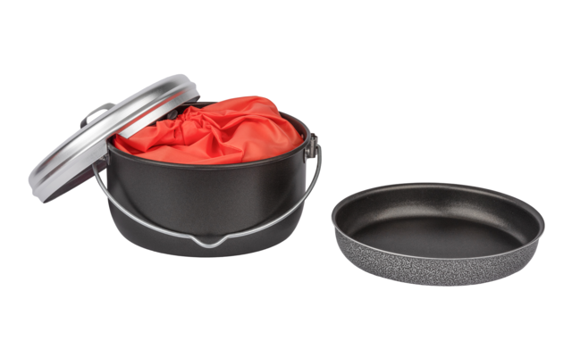 Campingset mit Wasserkocher, Bratpfanne und Zubehör, zu verwenden über jeder Wärmequelle.