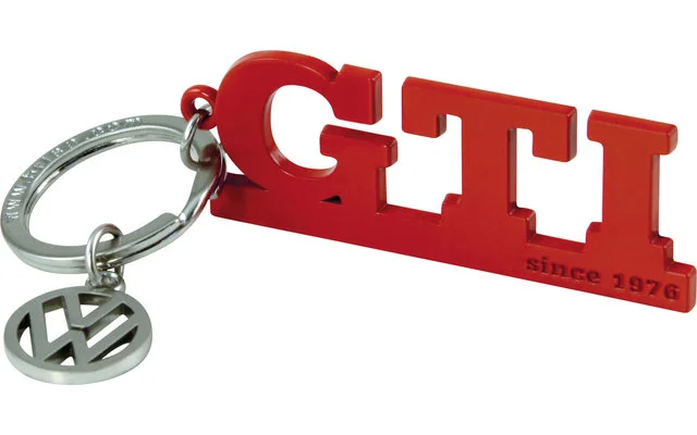 Schlüsselanhänger als GTI Schriftzug mit VW Charm Anhänger. Auf dem Schriftzug ist „since 1976“ eingeprägt. Maße: 10 x 3 cm