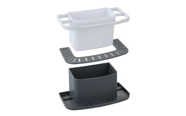 Im Behälter findet das Geschirrspülmittel einen festen Platz. Und seitlich ist ausreichend Stauraum für Schwämme, Spülbürste & Co. Besonders praktisch ist das umlaufende, abnehmbare Abtropfgitter – speziell zum Ablegen nasser Schwämme.