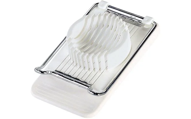 Die einzeln gespannten Edelstahldrähte zerschneiden das hartgekochte Ei schnell und sauber in runde oder ovale Scheiben, ohne dass das Eigelb zerbricht.