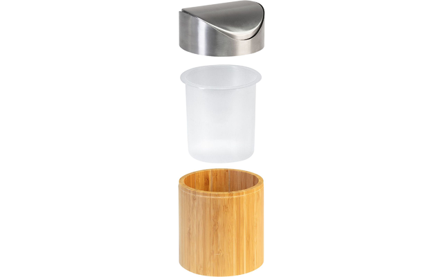 Attraktiver und stilvoller Mini-Mülleimer aus Bambus mit rostfreiem Edelstahl-Schwingdeckel und herausnehmbaren Kunststoffeinsatz, für den Einsatz in der Gastronomie oder Zuhause, zum praktischen und hygienischen Entsorgen von Tischabfällen und Co.